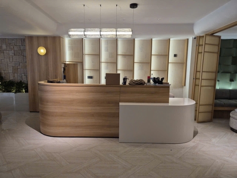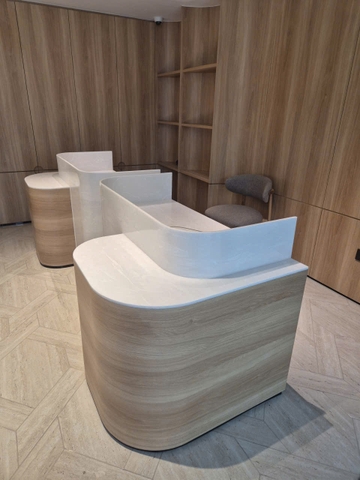 Đá solid surface Korean ứng dụng uốn cong nguyên khối không mí nối tạo tạo nên 1 quầy lễ tân độc đáo cho văn phòng.