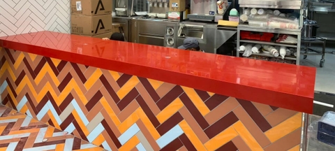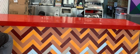 - Đá solid surface korean màu đỏ độc đáo , hiện đại hiện rất được ưa chuộng thiết kế làm điểm nhấn cho quán Trà Sữa, quán cà phê, Gà rán...