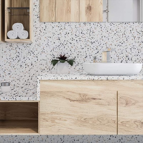Đá solid surface koreanTerrazzo nổi trội phù hợp cho không gian năng động như ốp mặt bếp, quầy Bar, bàn đảo, quầy lẽ tân ...