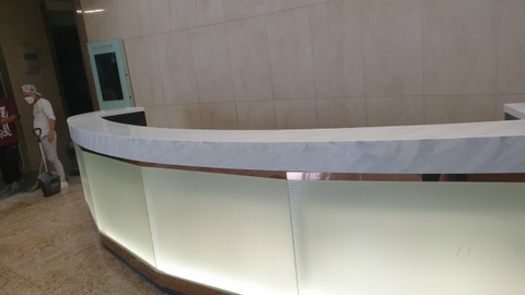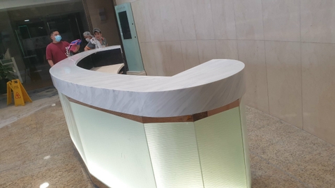 Hoàn thiện mặt đá solid surface vân mây ốp quầy uốn cong tại quận 1 Hồ Chí Minh