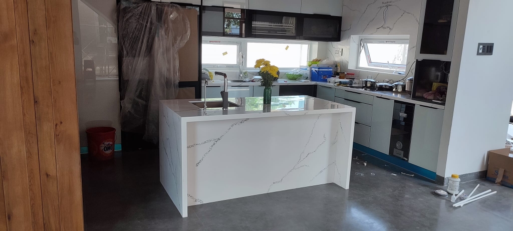 Hoàn thiện ốp mặt đá solid surface màu vân mây mã LVA -3507 Calacatta ốp bản đảo vách tại thành phố Thủ Dầu 1, Tỉnh Bình Dương